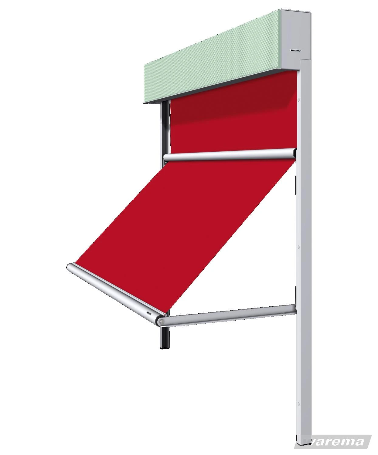 Markise in Rot mit grünem verputzbaren Kasten als Markisolette