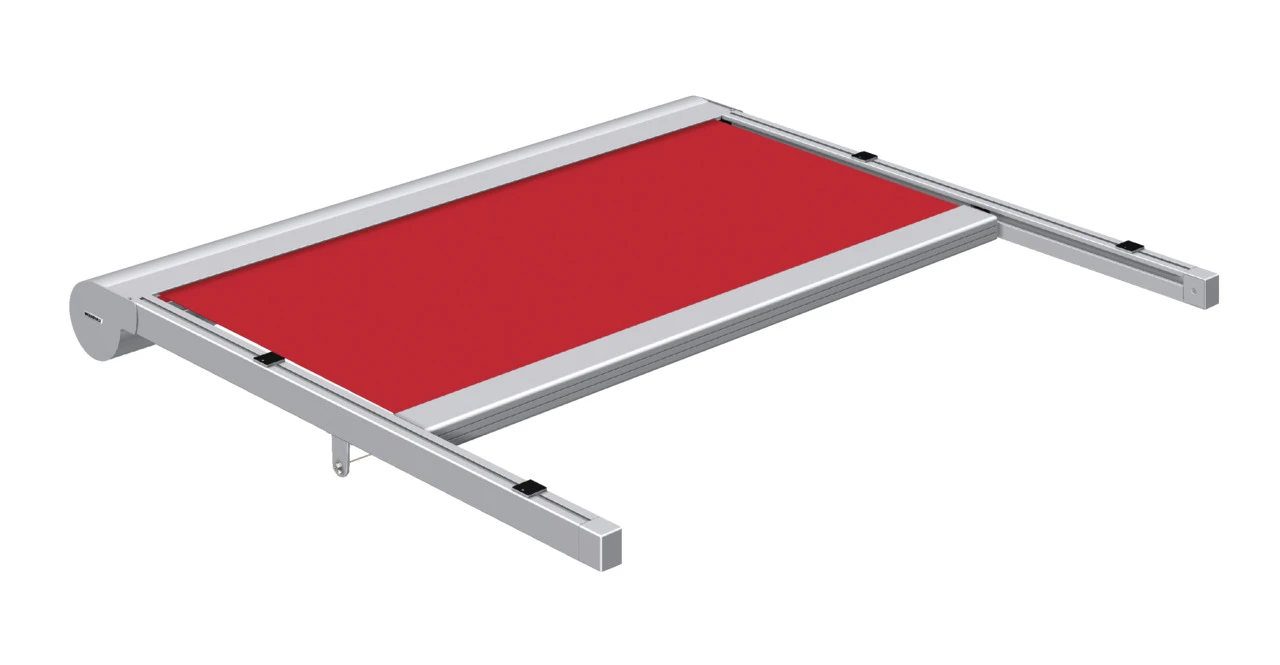Detailansicht einer Warema Terrassenmarkise mit rotem Markisentuch